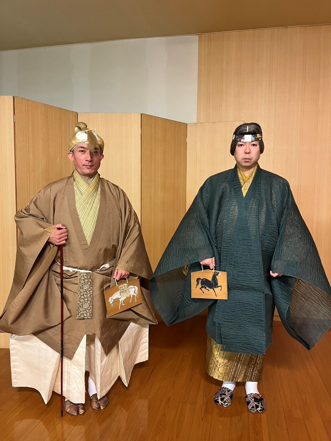 写真1枚目は前シテ。舞台に出る直前に鏡の間にて、ツレの當山 淳司さんと。